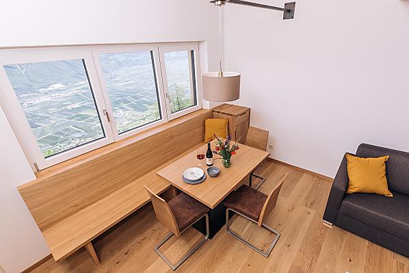 Nasze gospodarstwo jest polozone na wysokosci okolo 800 m n.p.m. Posród winnic i lasów nasi goscie maja wspanialy widok. Na naszych chronionych przed wiatrem loggiach mozesz cieszyc sie kazda pogoda. W zaleznosci od pory roku i dostepnosci, nasi goscie moga bezplatnie wziac swieze owoce i warzywa z naszego koszyka.