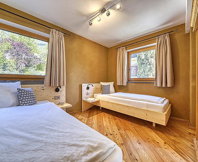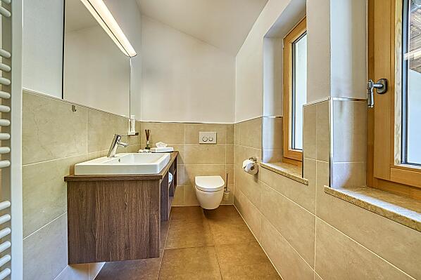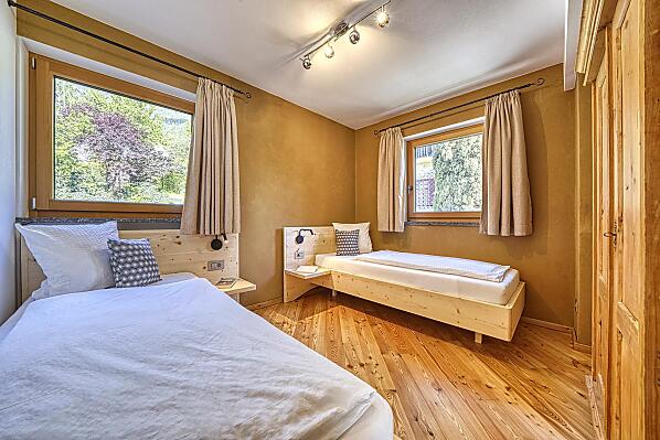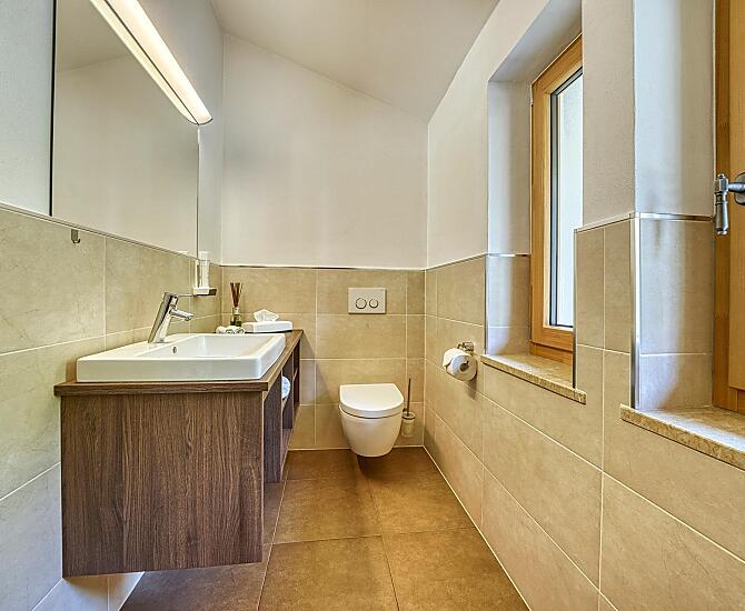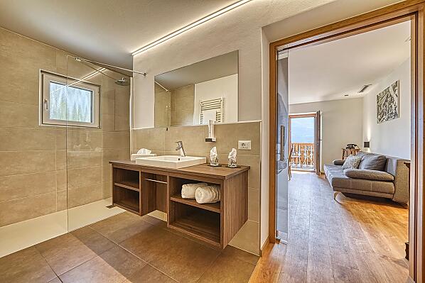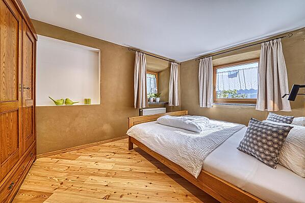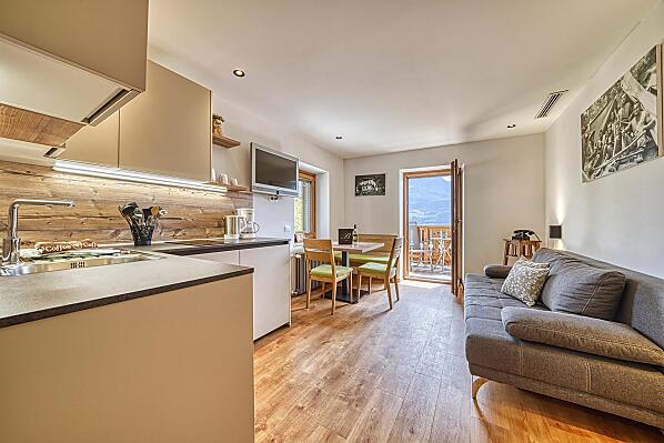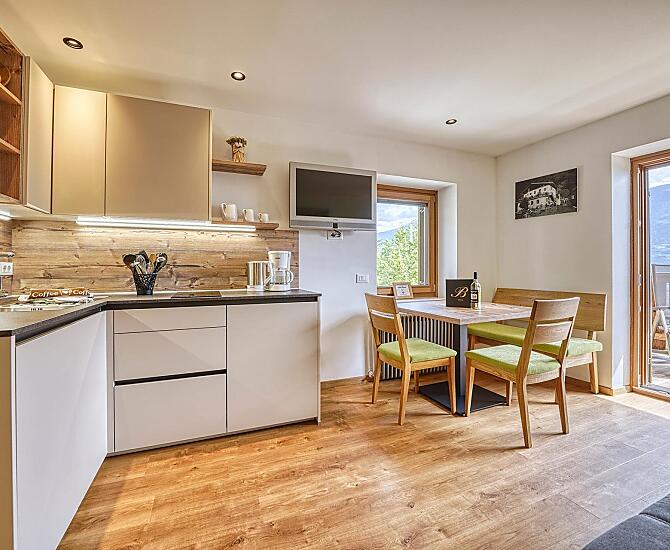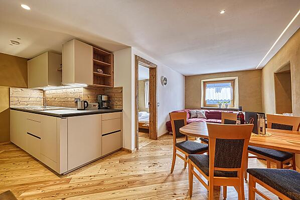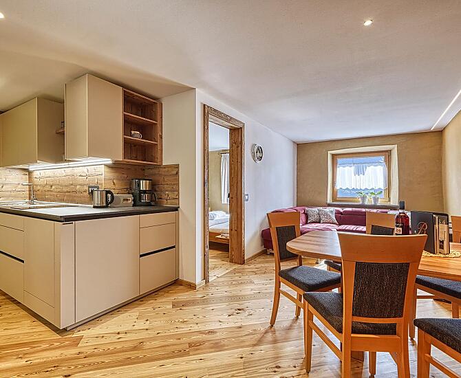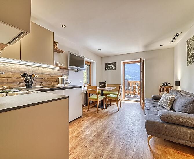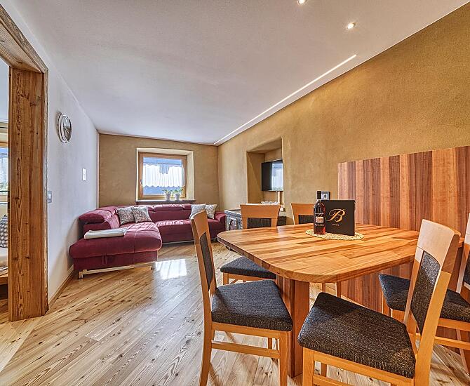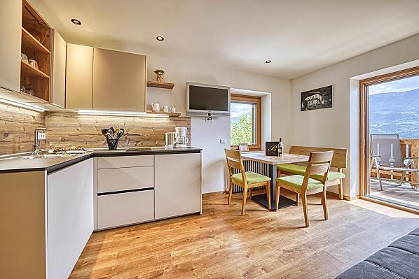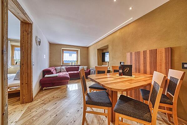 Wakacyjny apartament „Schloss Prösels” znajduje sie na parterze i prowadza do niego zaledwie 2 stopnie. Jak sama nazwa wskazuje, oferuje wspanialy widok na zamek Prösels i poludnie. Apartament sklada sie z kuchni z balkonem, pokoju dziennego z balkonem, sypialni rodziców, sypialni z lózkiem na antresoli oraz lazienki.