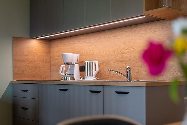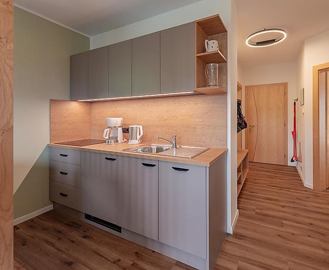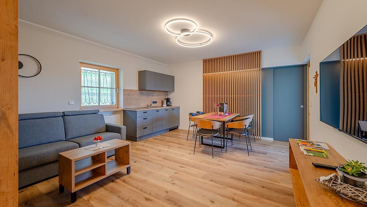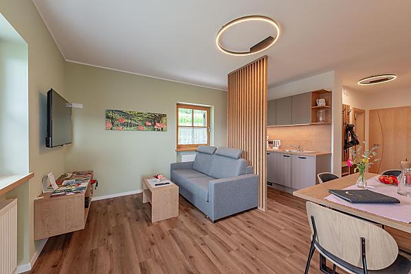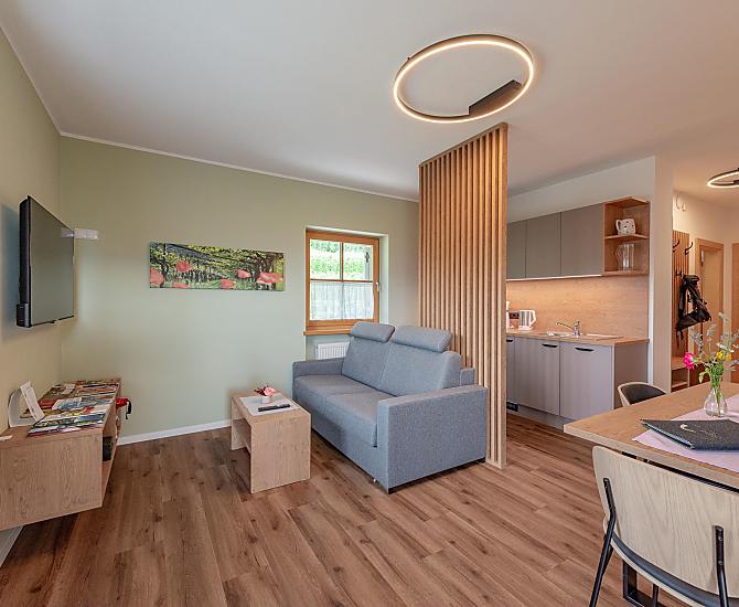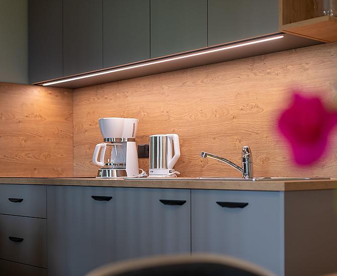 Apartament „Karele” doskonale nadaje sie na wypoczynek rodzinny. Ciesz sie pieknymi wnetrzami z dwiema sypialniami i duzym ogrodem. Centralnym punktem jest przestronna i jasna kuchnia z duzymi przeszkleniami, polaczona z salonem. Do apartamentu przylega duzy prywatny ogród, a strefa wewnetrzna i zewnetrza plynnie sie przenikaja.