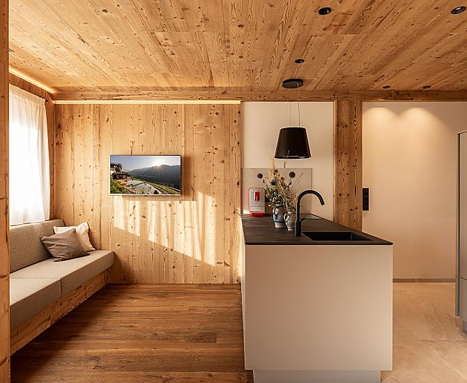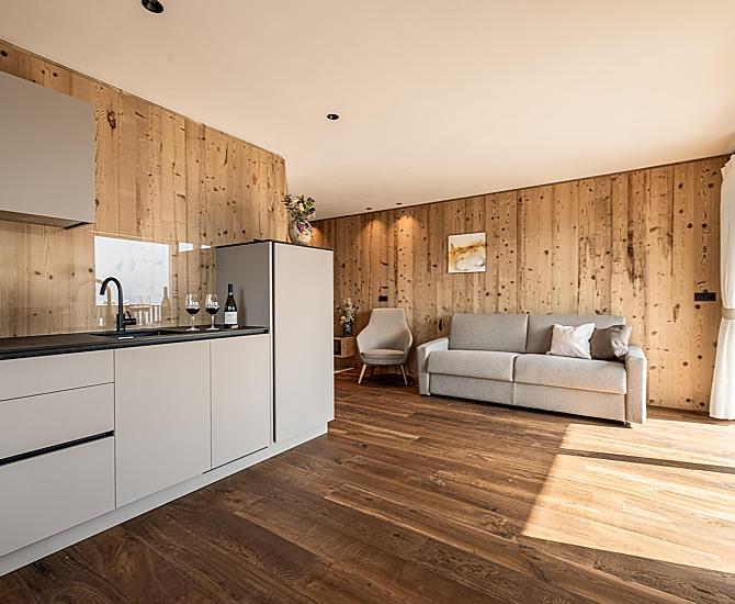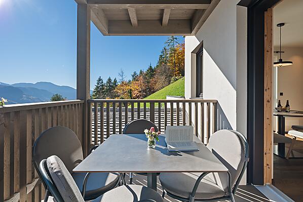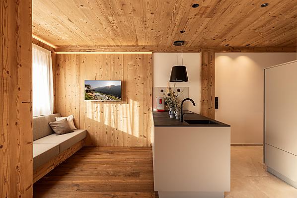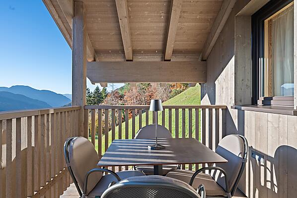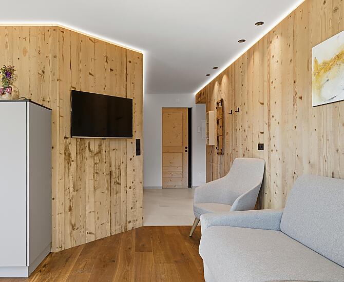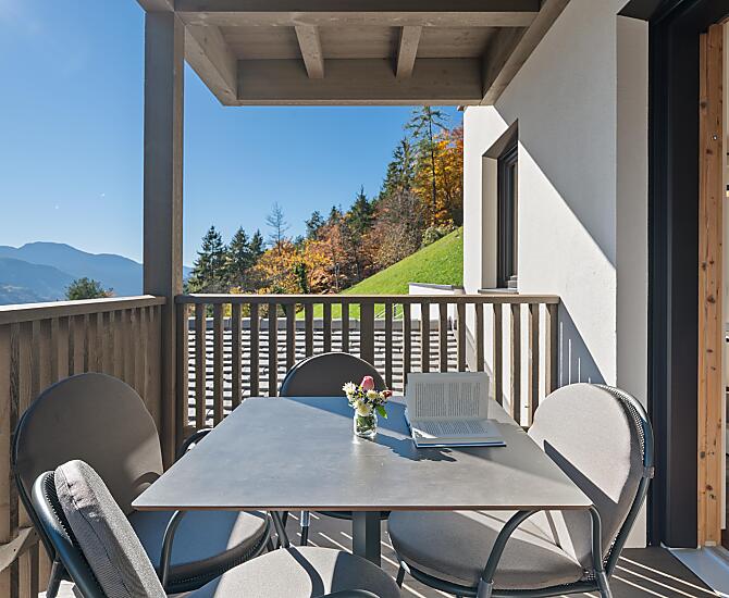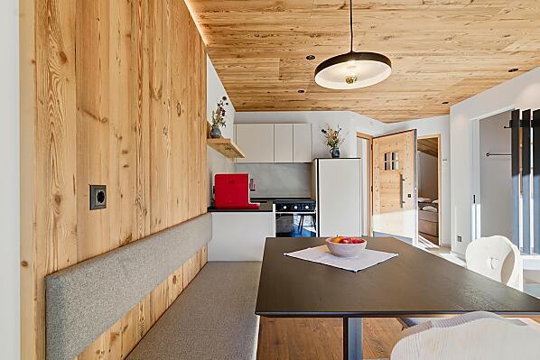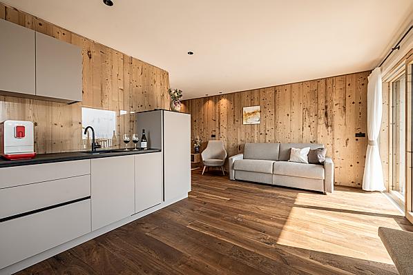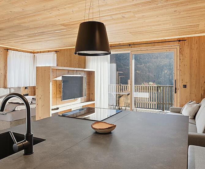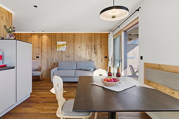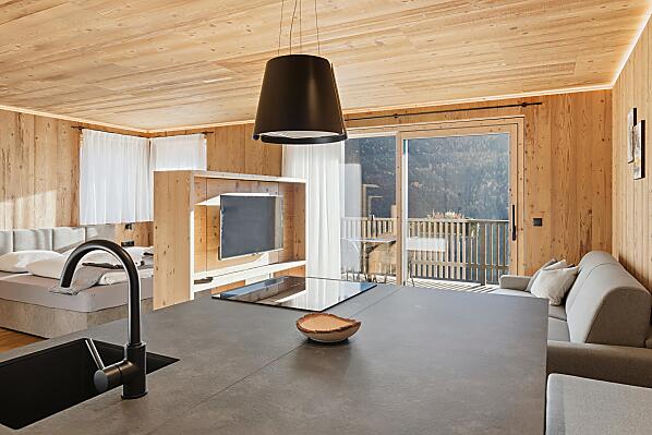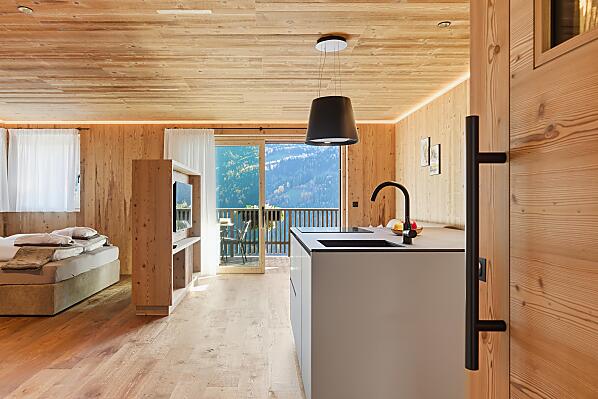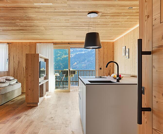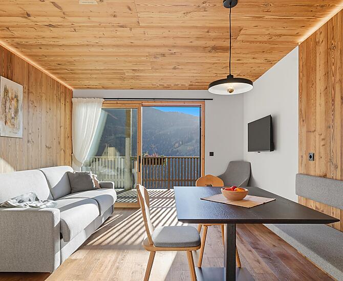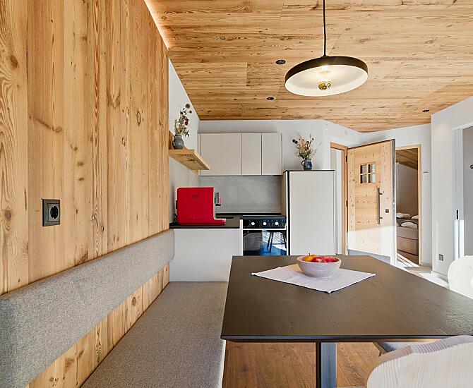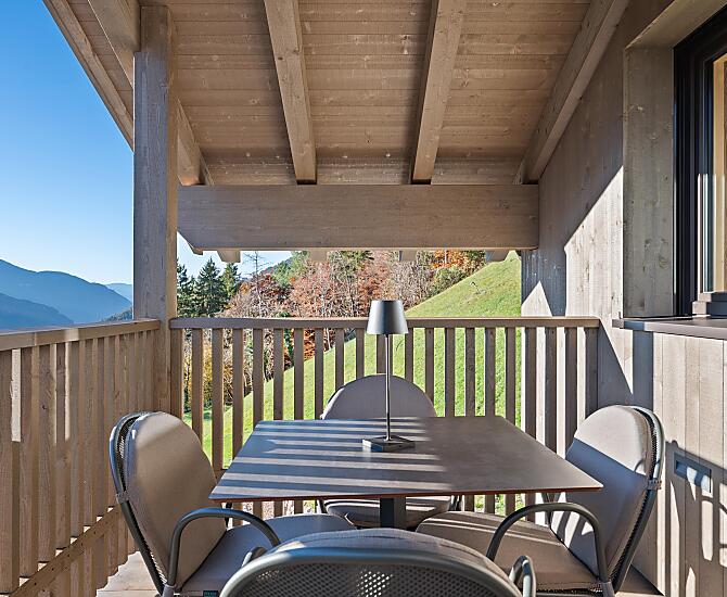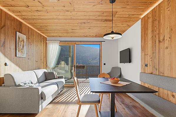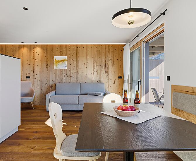 Stylowo urządzone apartamenty z prywatnym tarasem łączą w sobie nowoczesny komfort z alpejskim urokiem. Pięknie zaprojektowana przestrzeń zewnętrzna i ekskluzywne centrum wellness z sauną i pokojem relaksacyjnym zachęcają do odprężenia ciała i umysłu.