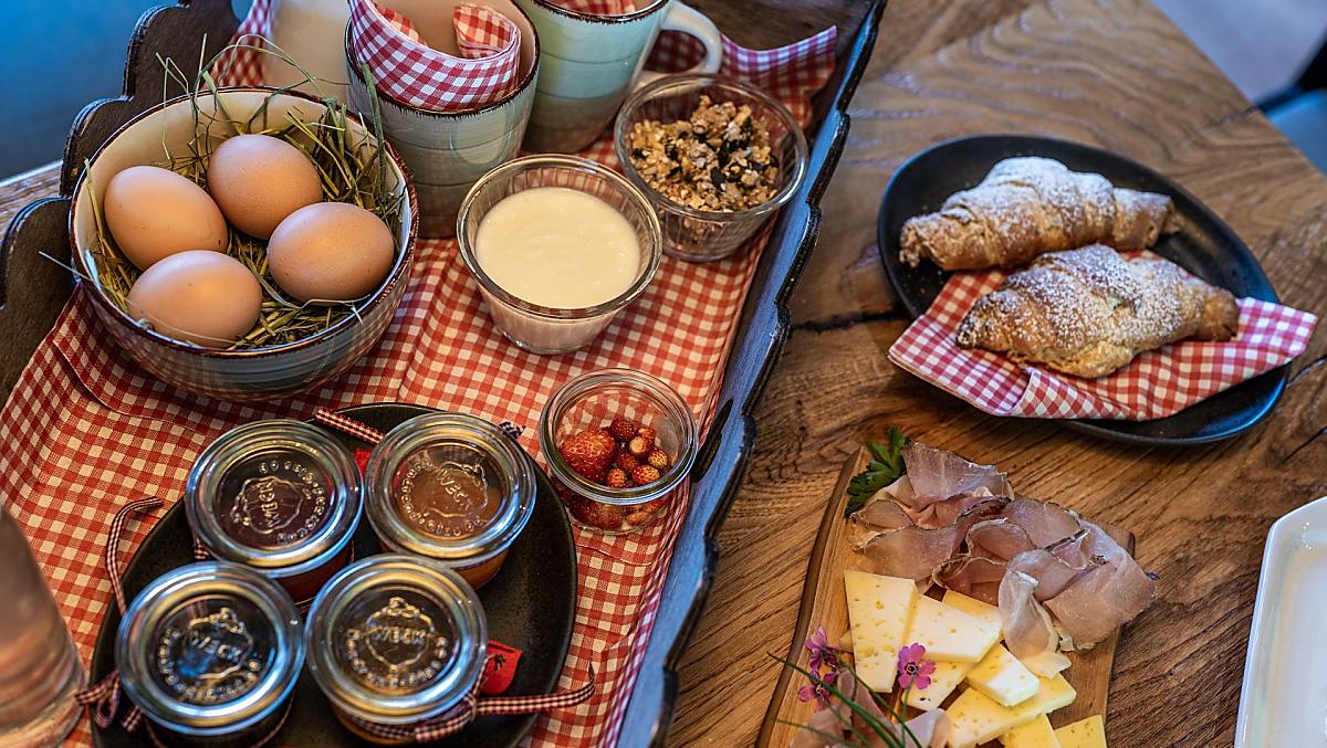- Produkty z własnego gospodarstwa na śniadanie: mleka, jogurt, ser, masło, inne produkty mleczne, speck, wędliny, jajka, miód, dżemy, syrop, soki owocowe, chleb, pieczywo