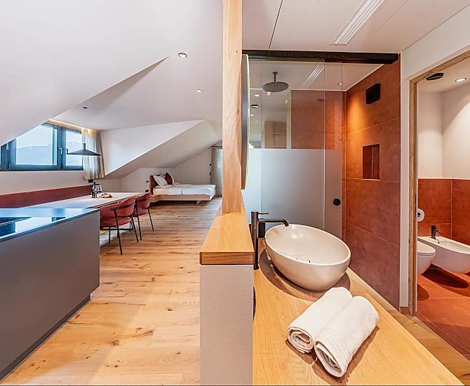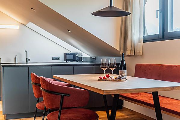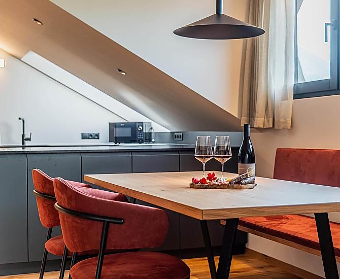 Ciesz się niezapomnianymi dniami w naszym świeżo odnowionym, pełnym światła apartamencie wakacyjnym, który łączy w sobie nowoczesny komfort z wiejską idyllą. Przestronny, otwarty salon zachęca do relaksu i oferuje wspaniały widok na malownicze winnice St. Magdalena.