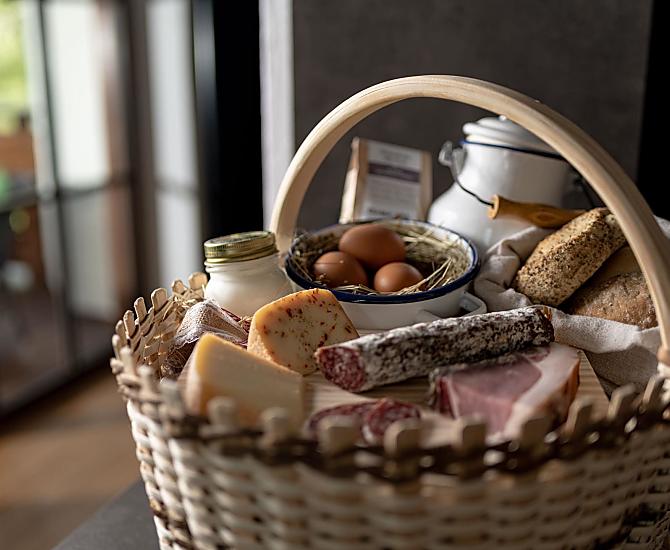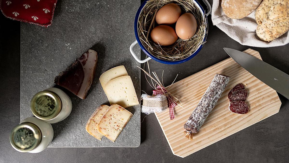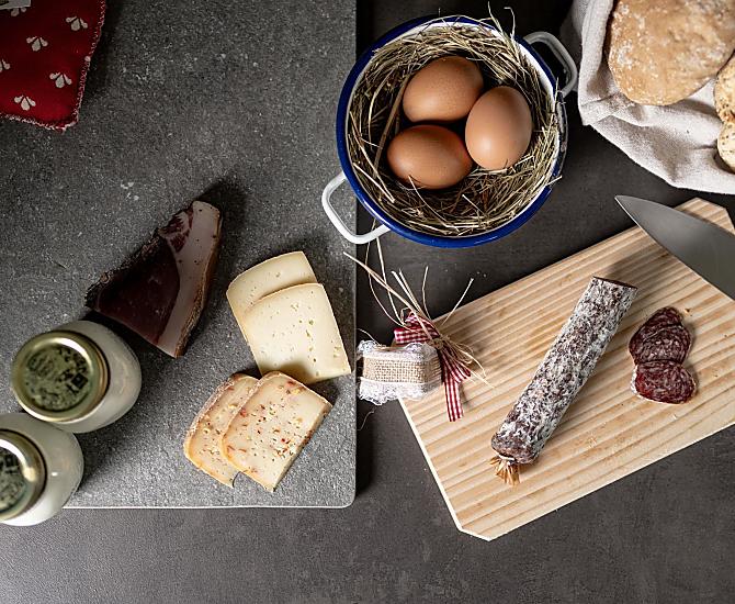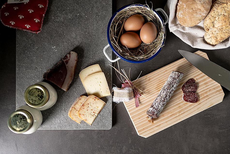 - Produkty z własnego gospodarstwa na śniadanie: mleka, jogurt, ser, speck, wędliny, jajka, syrop, herbaty ziołowe, przyprawy ziołowe, świeże warzywa sezonowe