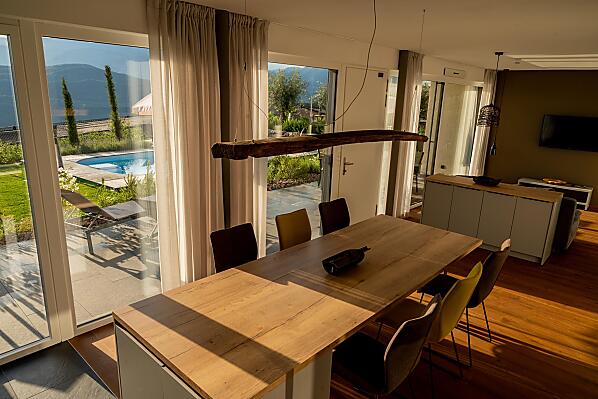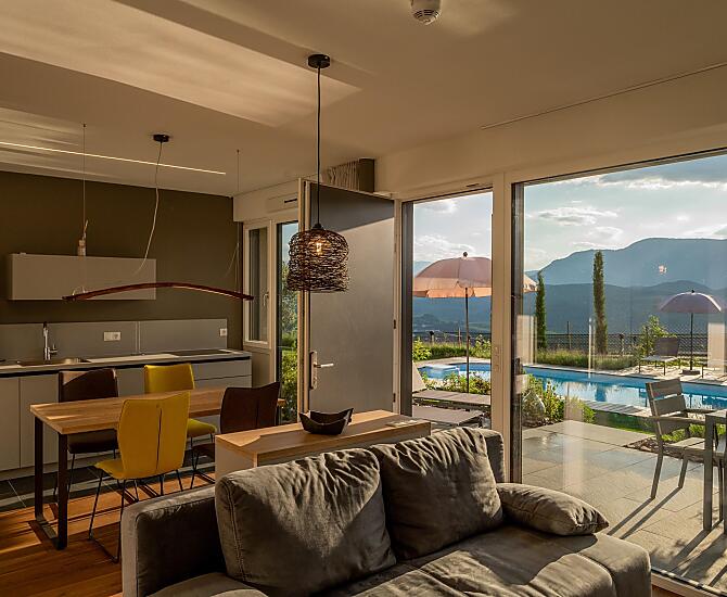Lobiserhof jest polozony na wysokosci 510 m n.p.m. w Kaltern, w St Anton, pomiedzy wlasnymi winnicami i jabloniami. Farma, do której prowadzi prywatna droga, lezy w ciszy, z dala od glównych dróg i urzeka zapierajacym dech w piersiach widokiem. Z tylu majestatycznie i ochronnie wznosi sie masyw Mendla, natomiast z przodu masz nieograniczony widok na centrum Kaltern i okolice, w tym winnice i wzgórza. Jesli pozwolisz, by twój wzrok powedrowal na nieco oddalony Mitterberg, w tle bedziesz mógl podziwiac liczne szczyty górskie wokól ogrodu Rosengarten, a po lewej i prawej stronie obraz dopelnia widok na Leuchtenburg i miasto Bolzano. Miejsce to zacheca do przebywania w nim o kazdej porze dnia, a kiedy próbujesz przetworzyc kolory i wrazenia, nie zauwazasz nawet, ze juz zwalniasz i uspokaja sie twój puls.