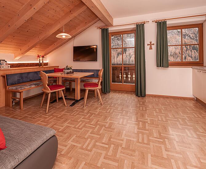 Piekny apartament „Margerite” („Stokrotka”) z balkonem wychodzacym na poludnie oferuje cudowny widok na Alpy Sarntalskie.