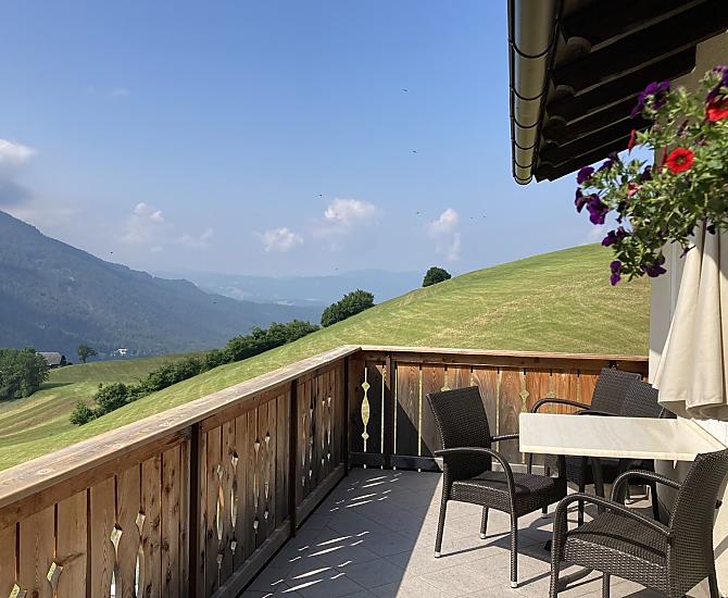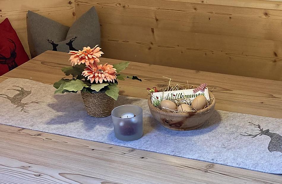 Od listopada do końca maja mamy w oborze około 30 sztuk bydła simentalskiego, w tym cielęta i jałówki. Latem prawie wszystkie nasze zwierzęta są wypuszczane na zewnątrz na górskie pastwiska, podczas gdy najmniejsze pozostają w oborze. Nadal mamy kury, koty, owce i króliki, które możesz podziwiać lub głaskać. Piękny ogród wiejski i kilka drzew owocowych zdobią nasz trawnik do opalania. Istnieją również różne opcje zabaw na świeżym powietrzu i mnóstwo miejsca dla najmłodszych. Nasi goście zawsze mówią, że mieszkamy w raju - to dla nas najlepsza pochwała!