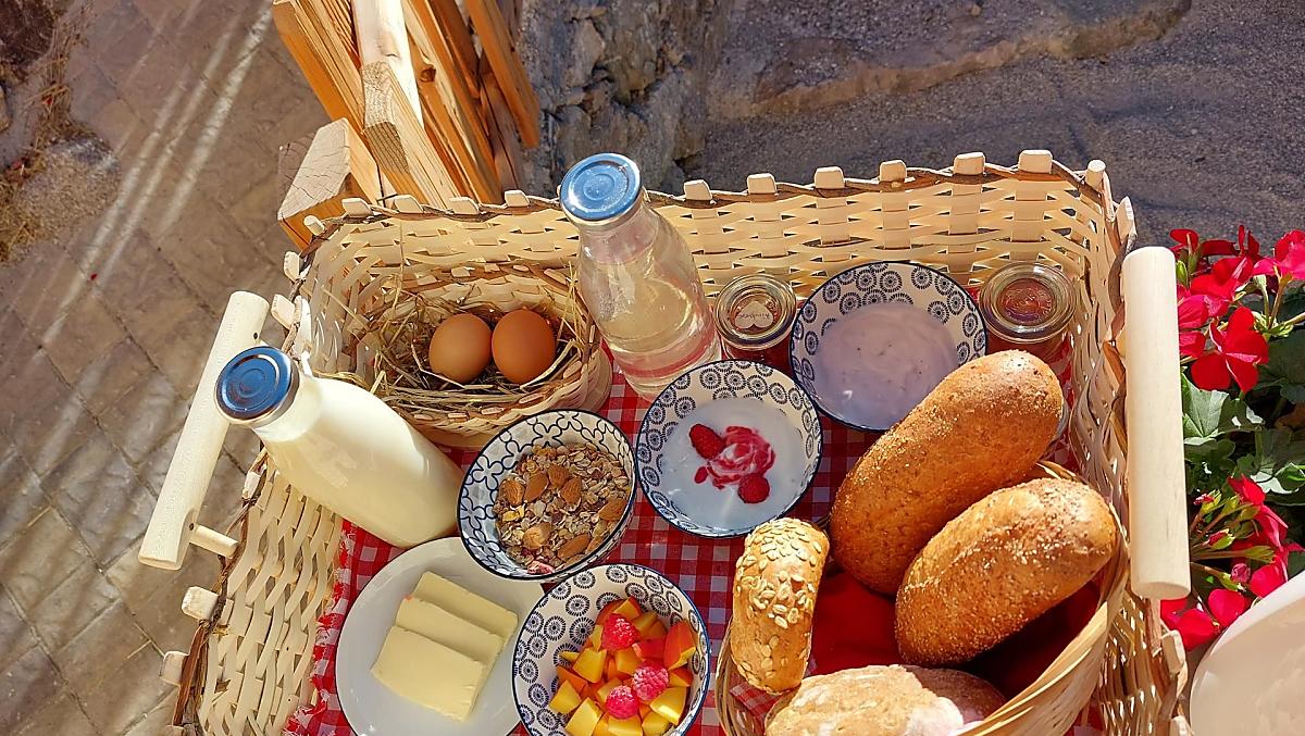 - Produkty z własnego gospodarstwa na śniadanie: mleka, jajka, dżemy, syrop, herbaty ziołowe, przyprawy ziołowe, świeże owoce sezonowe