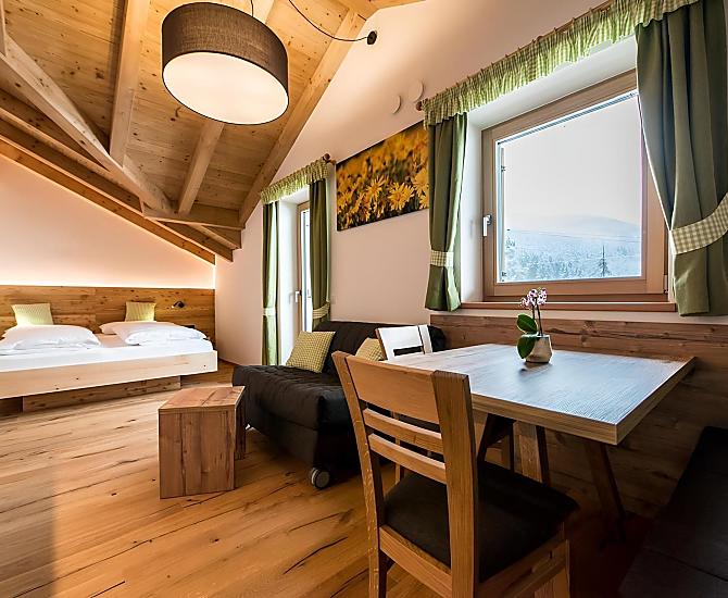 Pokój „Rosenstube” (30 m²) mozna wynajac jako dodatkowy pokój do wszystkich apartamentów. To idealne miejsce dla dziadków, którzy przyjezdzaja na wakacje razem z rodzina. Z balkonu roztacza sie wspanialy widok na szeroka doline Gsieser Tal i Dolomity na horyzoncie.