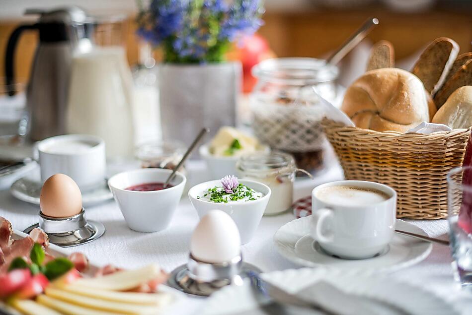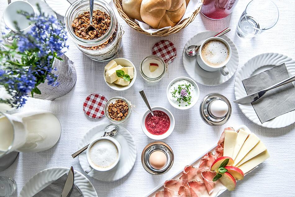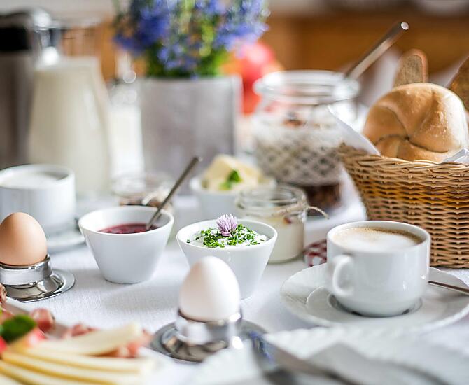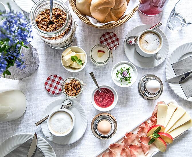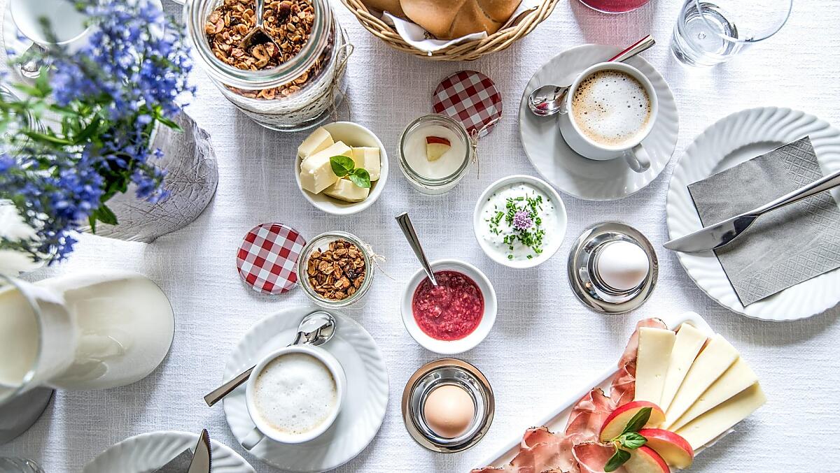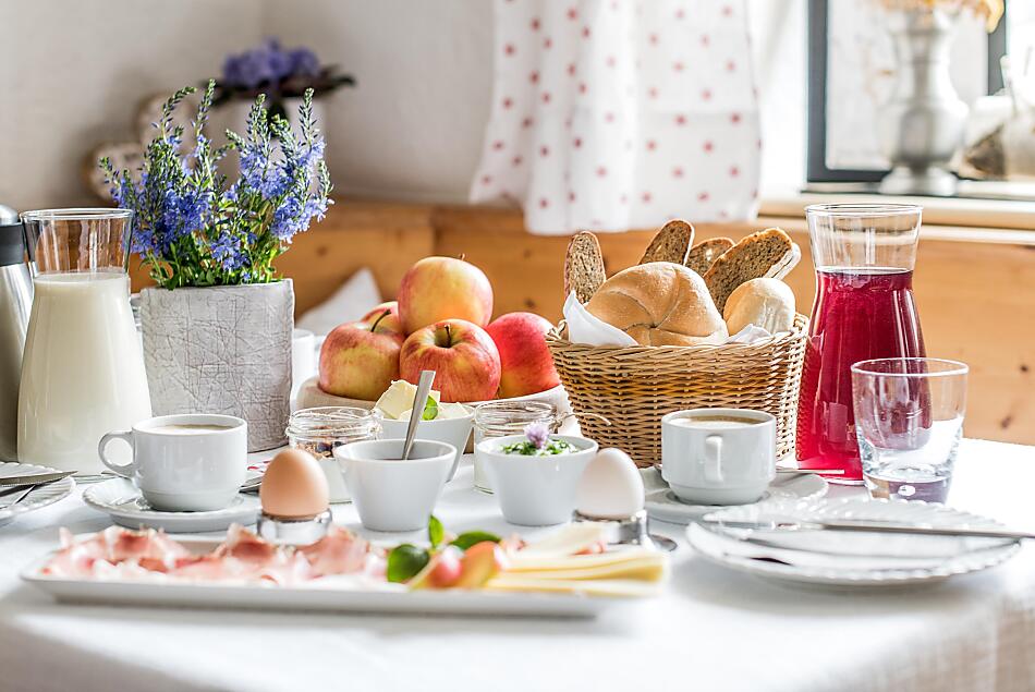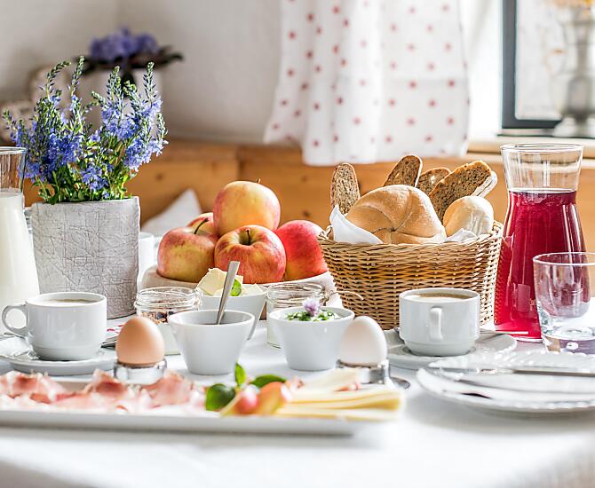 - Produkty z własnego gospodarstwa na śniadanie: mleka, jajka, dżemy, syrop, świeże owoce sezonowe