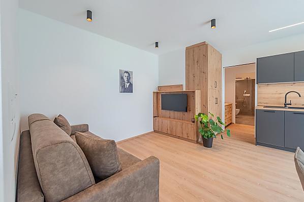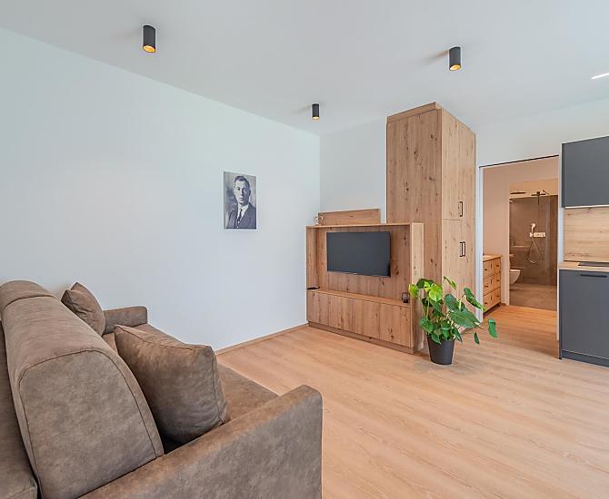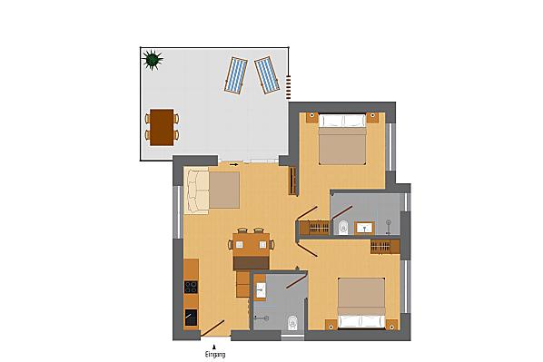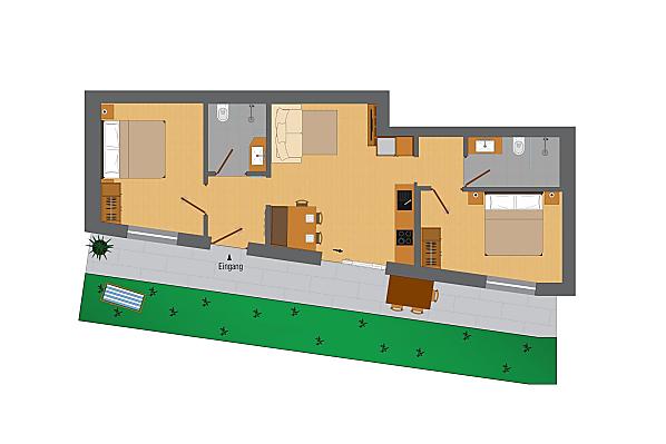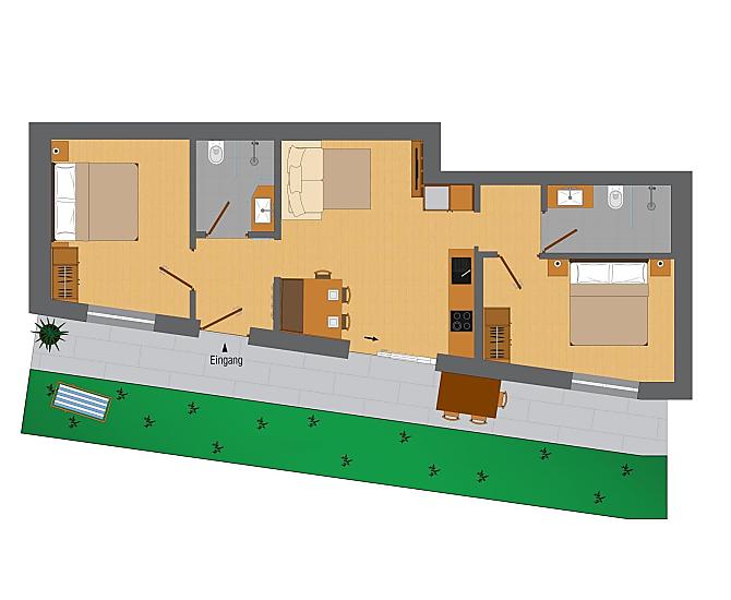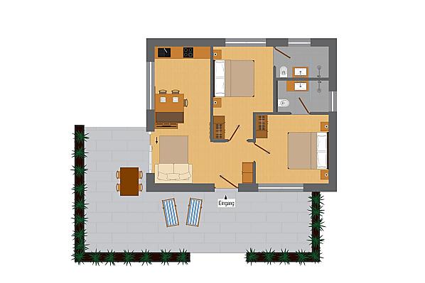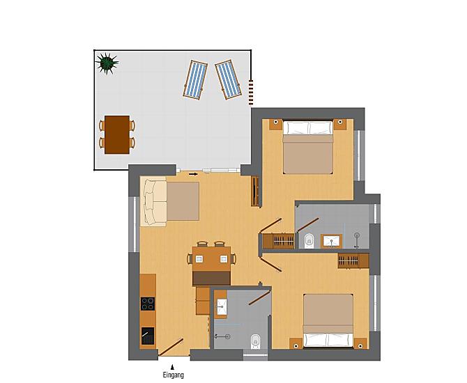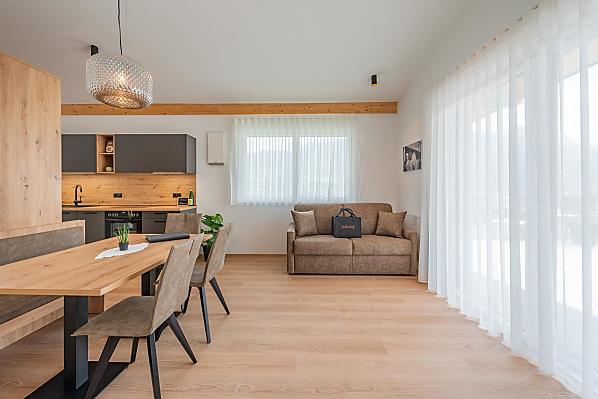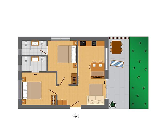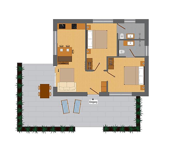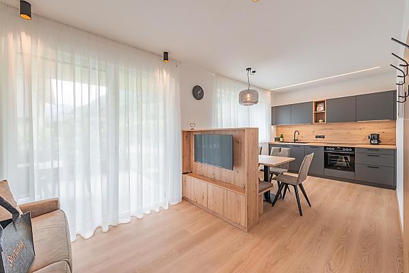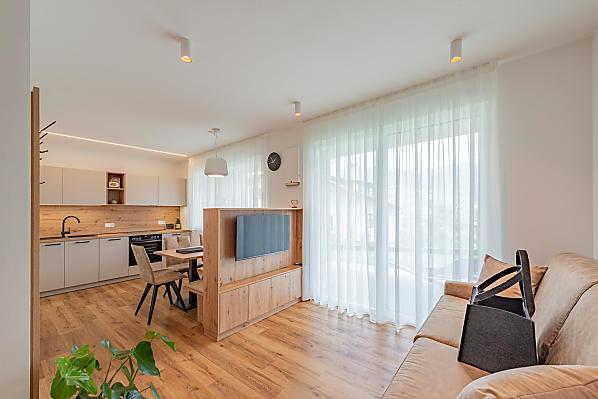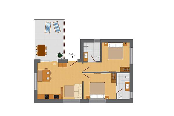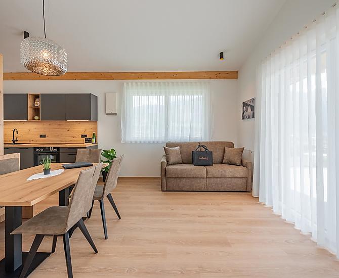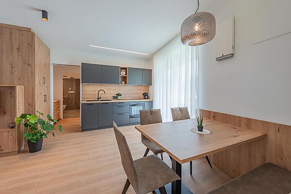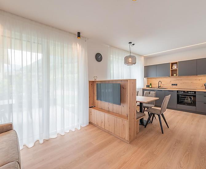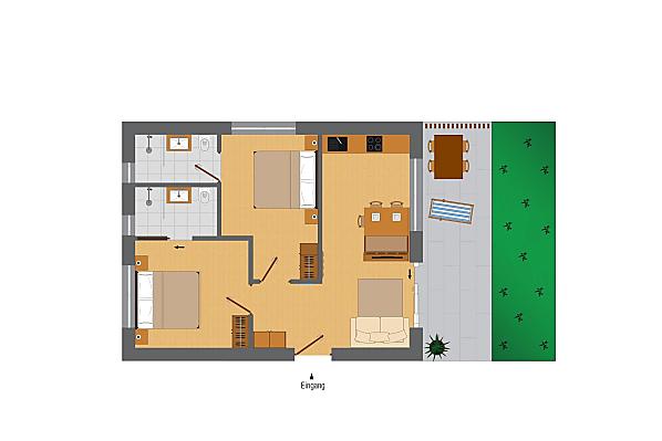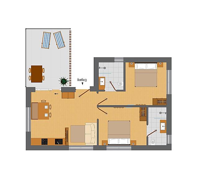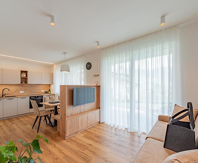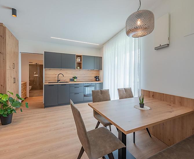 Do dyspozycji gości jest 5 nowoczesnych, przytulnych i w pełni wyposażonych mieszkań wakacyjnych, każde z tarasem, 2 sypialniami i 2 łazienkami.