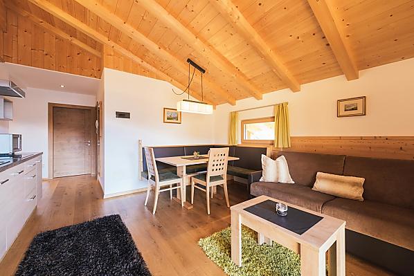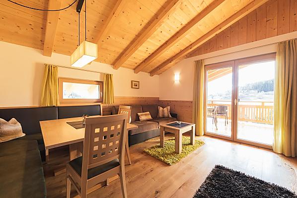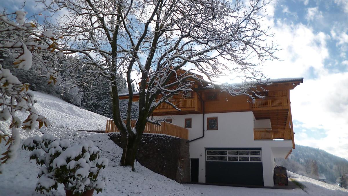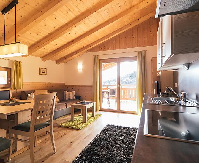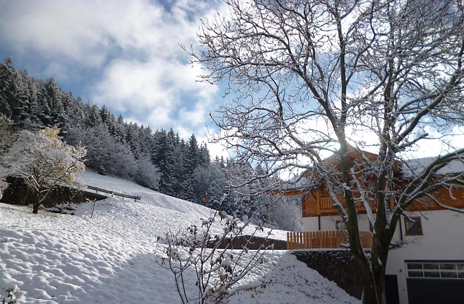 Thalerhof, nowy drewniany domek z czterema mieszkaniami wakacyjnymi, polozony w pieknym, slonecznym miejscu na plaskowyzu Tschögglberg w sercu Meraner Land, zaprasza na pobyt.