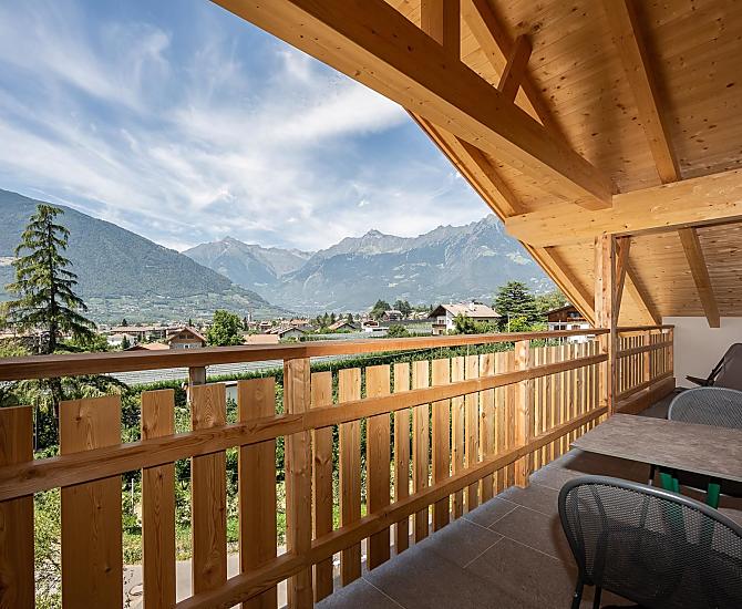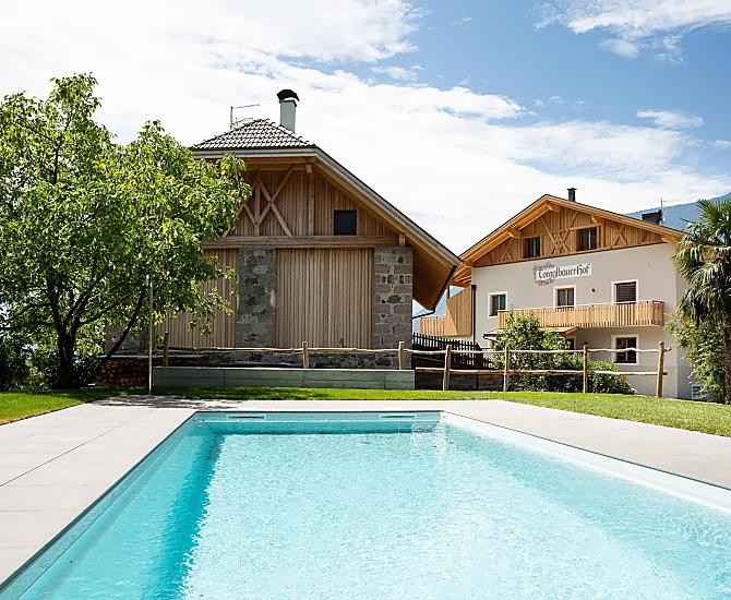 5 nowych mieszkań, basen ze słoną wodą z trawnikiem do opalania, wymarzone widoki, dużo ciszy i spokoju, blisko centrum Merano, wino i jabłka: to właśnie Torgglbauer.