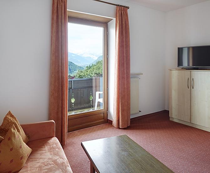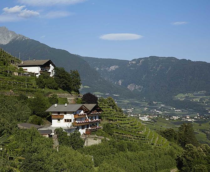 Nasze gospodarstwo położone jest powyżej uzdrowiska Merano, w otoczeniu zieleni, sadów i winnic. Z okien roztacza się wspaniały widok na dolinę Adygi i dolinę Venosta. Nasze gospodarstwo otoczone jest licznymi zabytkami i jest idealnym miejscem na wakacje dla osób szukających ciszy i spokoju oraz dla miłośników pieszych wędrówek.