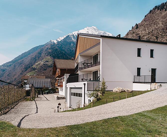 Gospodarstwo Vertignerhof położone jest w nasłonecznionej dzielnicy Partschins, w spokojnej, odosobnionej lokalizacji, a zarazem blisko centrum wioski. Z zadaszonego balkonu oraz z przestronnego terenu wokół domu roztacza się widok na nasze miasteczko Partschins, uzdrowiskowe Merano, park natury Texelgruppe, okoliczne pasma górskie, Burggrafenamt oraz dolinę Vinschgau. Do pobliskiego Merano można wygodnie dojechać komunikacją publiczną.