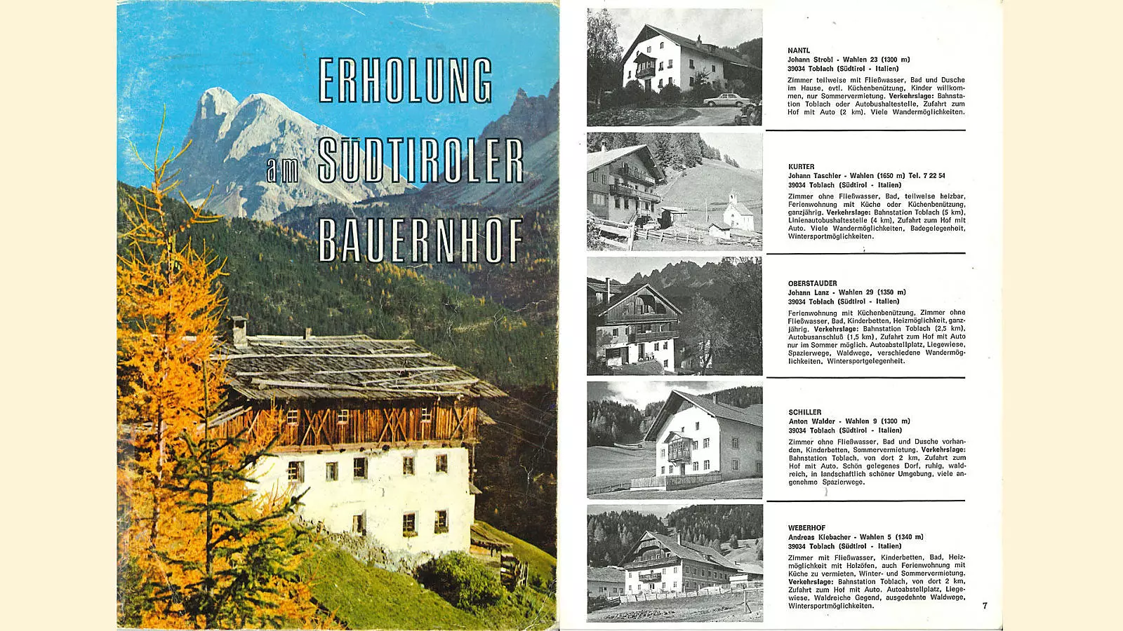 W 1971 roku ukazał się pierwszy katalog „Agroturystyka” z zestawieniem 236 gospodarstw w całym Południowym Tyrolu. Ciekawy szczegół: w tamtym czasie informacje na temat danego gospodarstwie skupiały się głównie na dojeździe do niego oraz na dostępie do wody w gospodarstwie.