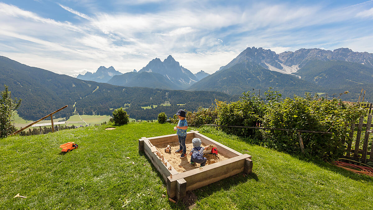 W Innichen, w Hochpustertal, dzieci bawią się w scenerii jak z pocztówki. Naturalny plac zabaw otacza wspaniała panorama Dolomitów.